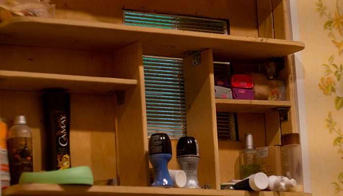 В распоряжении не очень просторная ванная? Отдельно выделять пространство не рационально. Вариант решения: смонтировать полочку. Стенкой которой будет вентиляционная решетка. В таком случае выиграют все, появится дополнительное место и не так дорого будет спрятать все «тюбики и бутылочки».