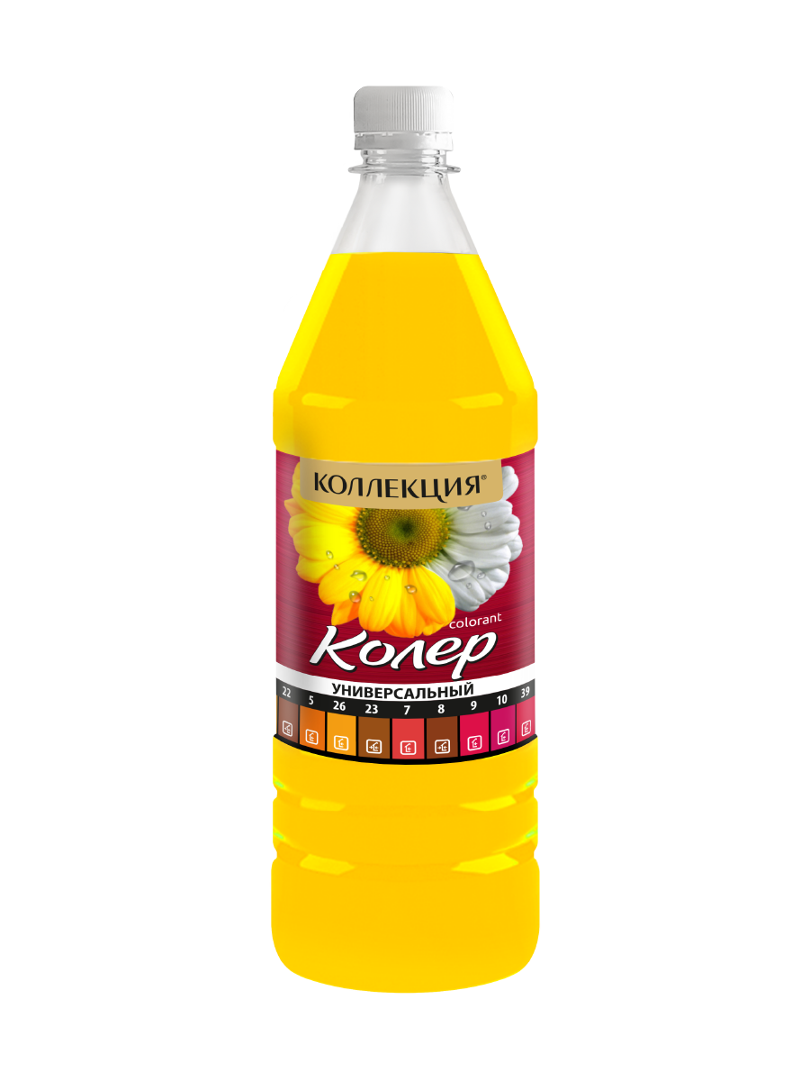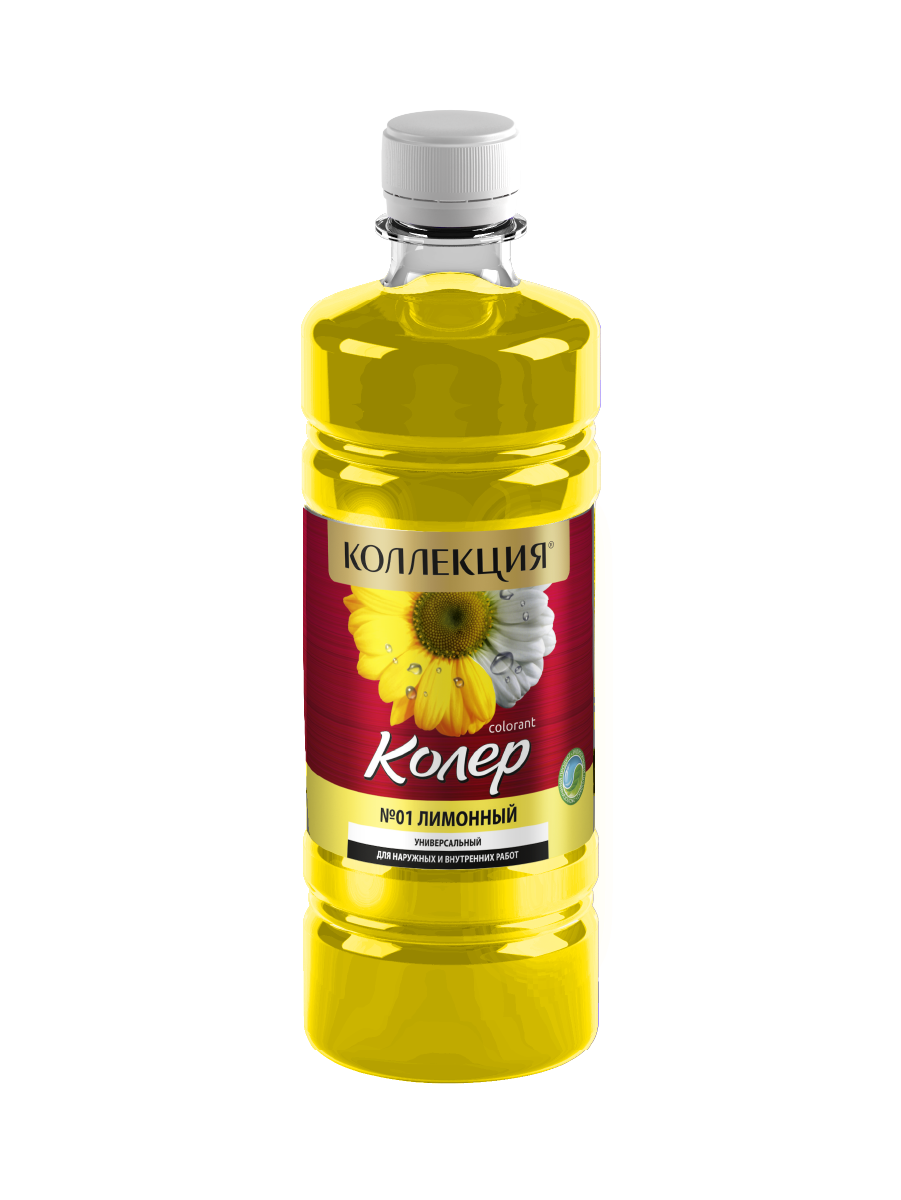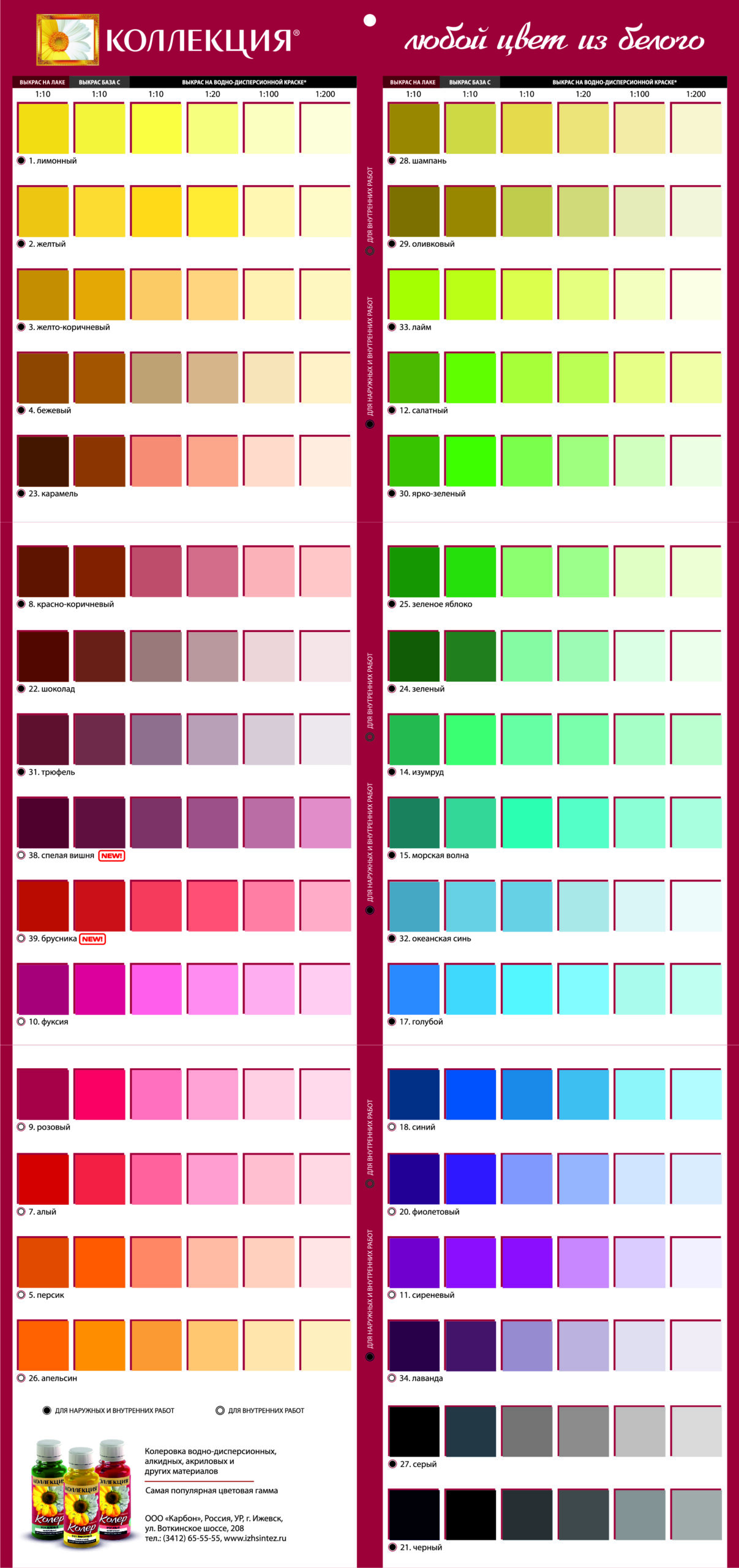 - Универсальность – колоранты пригодны для колерования широкого спектра материалов: водно-дисперсионных красок, алкидных эмалей, масляных красок, лаков, фактурных покрытий, цементных продуктов, эпоксидных и полиэфирных смол, а так же других составов.