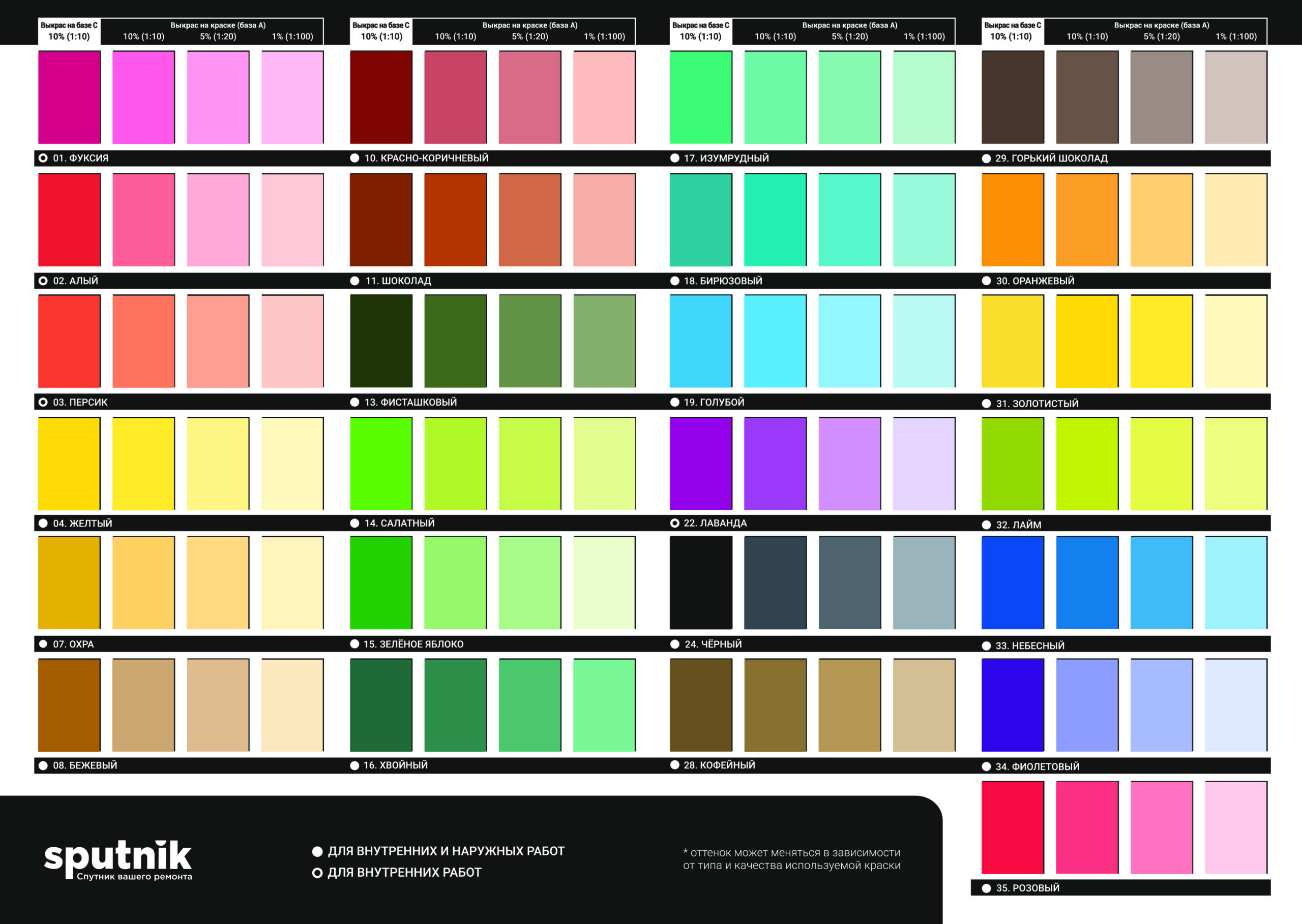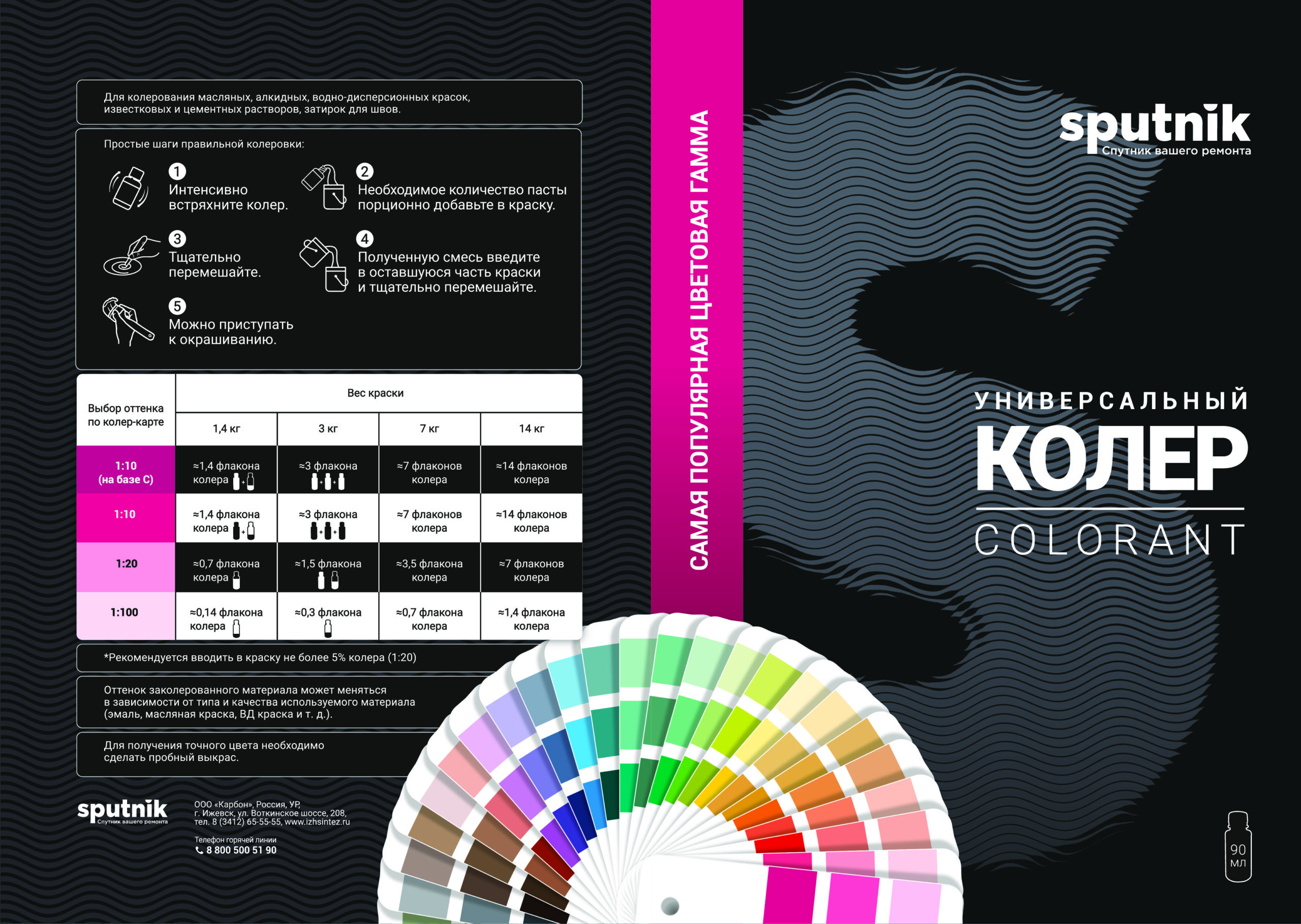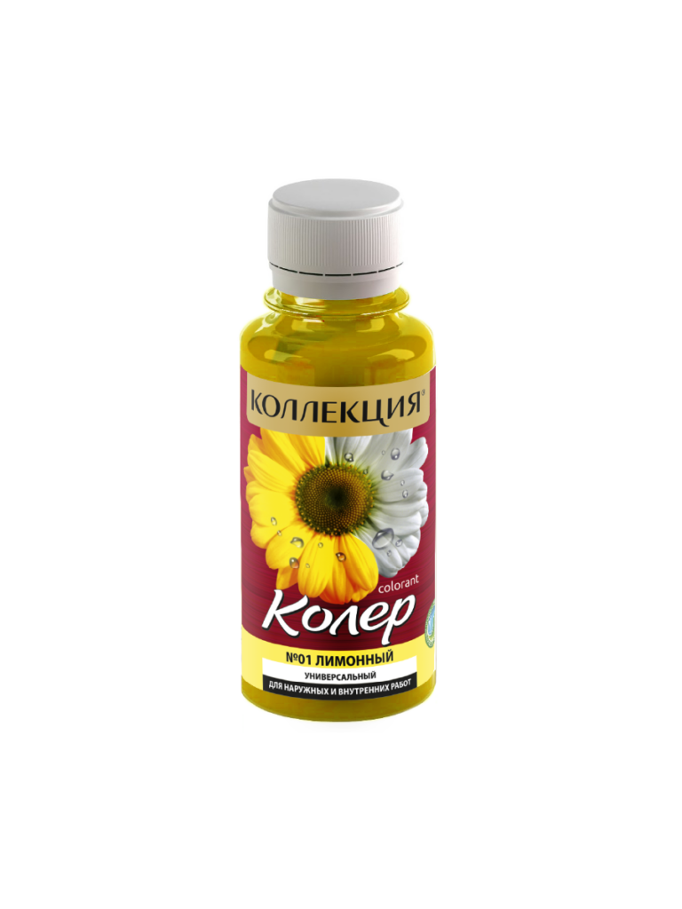 - Универсальность – колоранты пригодны для колерования широкого спектра материалов: водно-дисперсионных красок, алкидных эмалей, масляных красок, лаков, фактурных покрытий, цементных продуктов, эпоксидных и полиэфирных смол, а так же других составов.