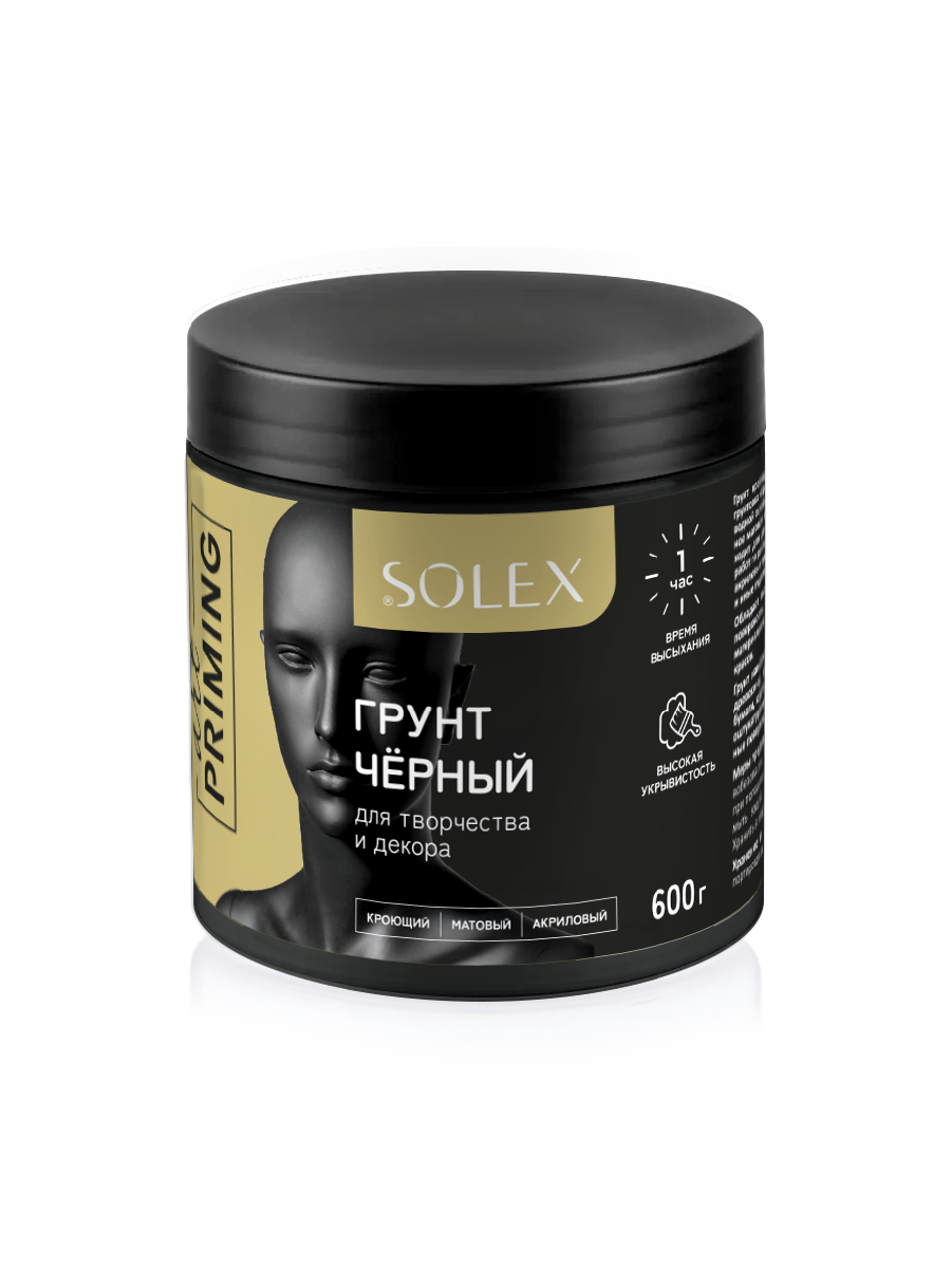 Грунт кроющий черный SOLEX – это акриловая грунтовка чёрного цвета. Грунт высокого качества на водной основе, не имеет запаха, образует однородное матовое покрытие чёрного цвета. Отлично подходит для декоративных и художественных работ, работ по реставрации мебели в качестве основы под акриловые краски и лаки, текстурные пасты, пастель и иные художественные материалы. Грунт наносится с помощью кисти или валика на древесину, холст, изделия из гипса, МДФ, ДСП, бумаги, картона, керамики. Может наноситься на оштукатуренные, кирпичные и другие минеральные поверхности.