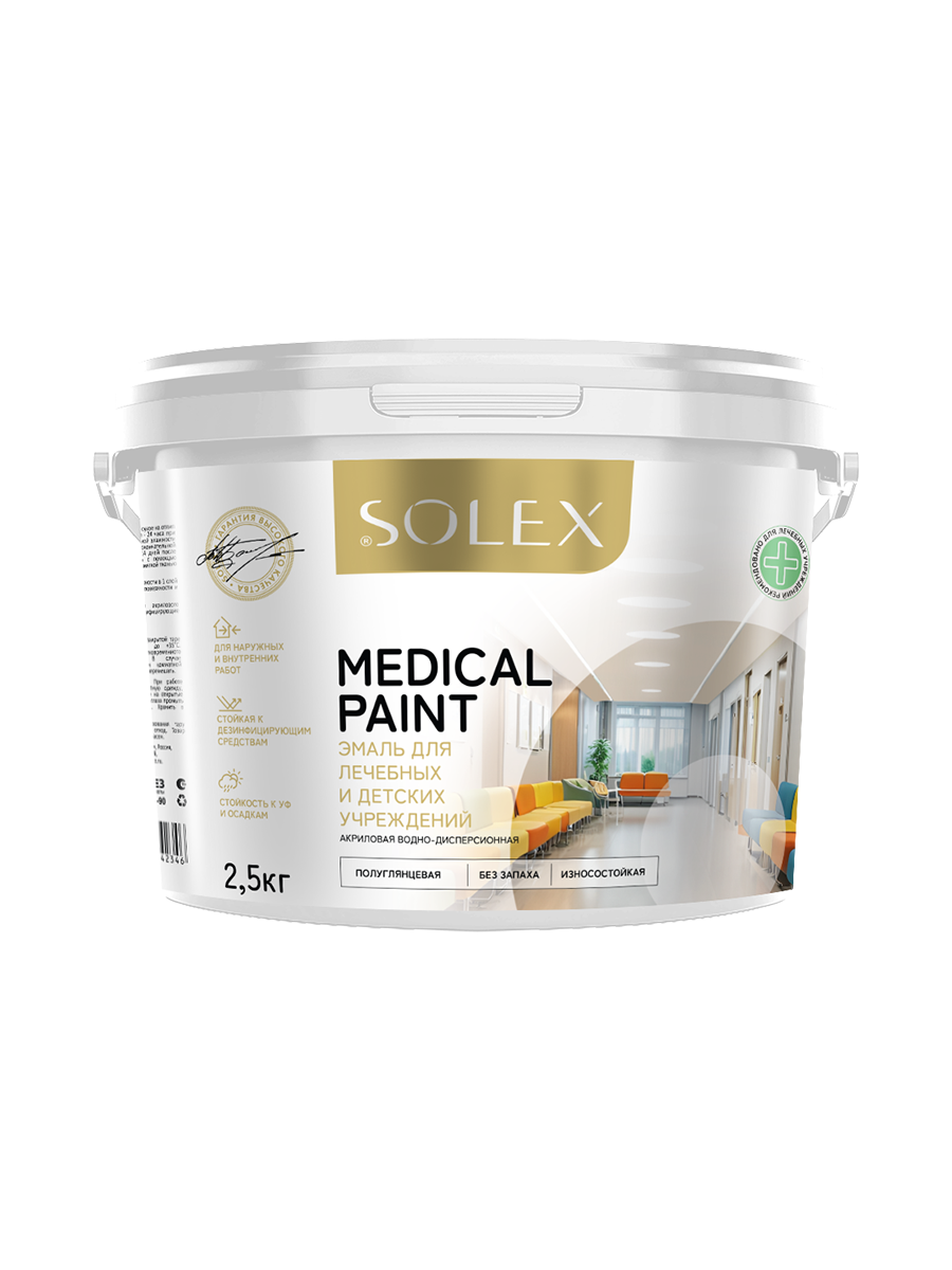 РЕКОМЕНДАЦИИ ПО ПРИМЕНЕНИЮ: Перед окраской основание должно быть чистым, сухим и прочным (очищенным от отслаивающейся краски, побелки, пыли, жиров, смазочных масел и т.п.). Твердые глянцевые поверхности необходимо отшлифовать до матового состояния, пыль удалить. Загрунтовать поверхность. Для получения максимальной адгезии рекомендуется использовать грунтовку SOLEX. Перед применением эмаль тщательно перемешать. Наносить кистью, валиком или краскораспылителем. Допускается разбавление водой не более чем на 5 % по массе. В зависимости от качества отделки наносят от 1 и более слоев после полного высыхания предыдущего слоя. Последний слой рекомендуется наносить неразбавленной эмалью. Инструмент и пятна отмыть водой сразу после окончания работ.