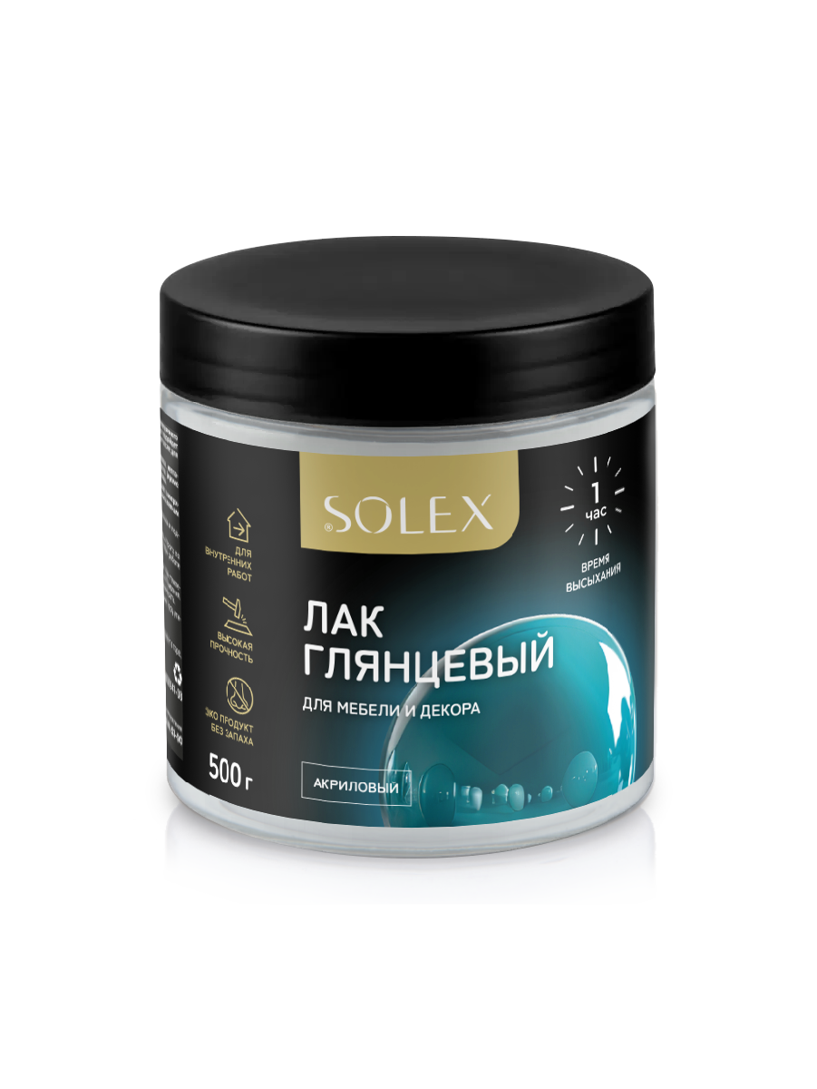 Лак SOLEX на водной основе предназначен для создания высокопрочного финишного покрытия. При полном высыхании лак образует прозрачную, прочную пленку. Придает поверхности глянцевый эффект. Обладает высокой стойкостью к истиранию, бытовым пятнам и мытью с использованием не абразивных моющих средств.