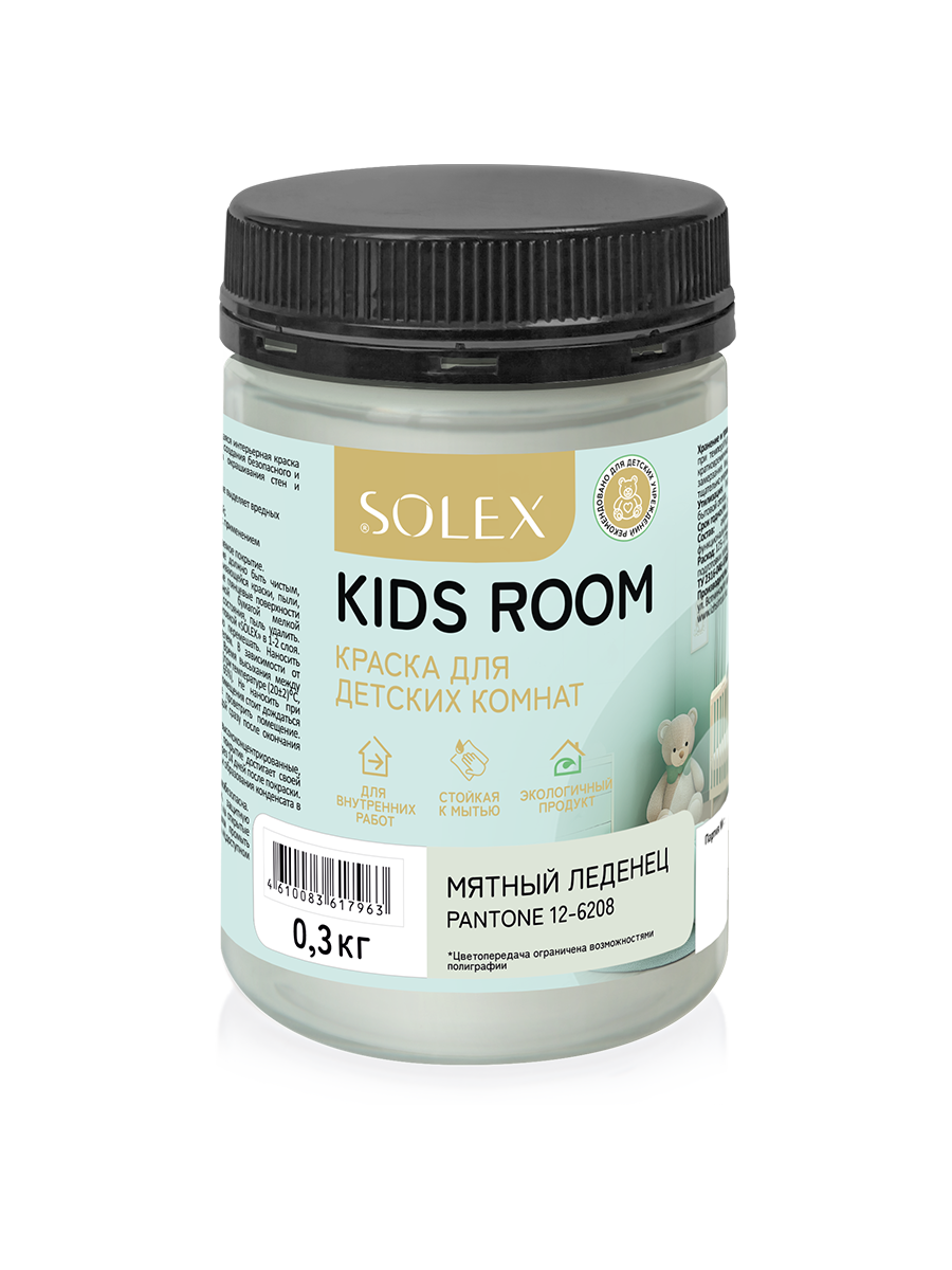 ЭКСПЛУАТАЦИЯ: не применять высококонцентрированные, абразивные моющие средства, а также не подвергать сильной очистке свежеокрашенную поверхность, так как свежее покрытие достигает своей окончательной твердости и стойкости через 14 дней после покраски. Не допускать прямого контакта с водой и образования конденсата в течение 2-х суток. В случае необходимости очистки покрытия в данный период можно применить легкую очистку влажной мягкой тканью. Участки игровых комнат, подверженные постоянному контакту рекомендуется дополнительно покрыть матовым лаком для мебели «Solex».